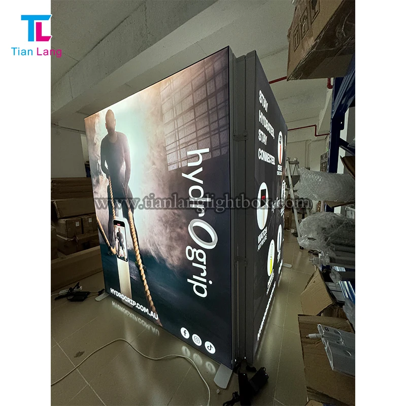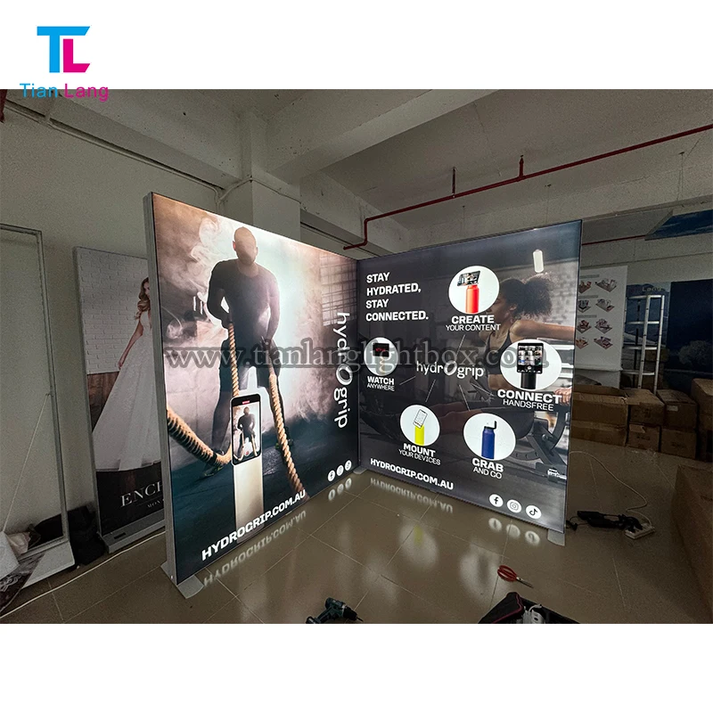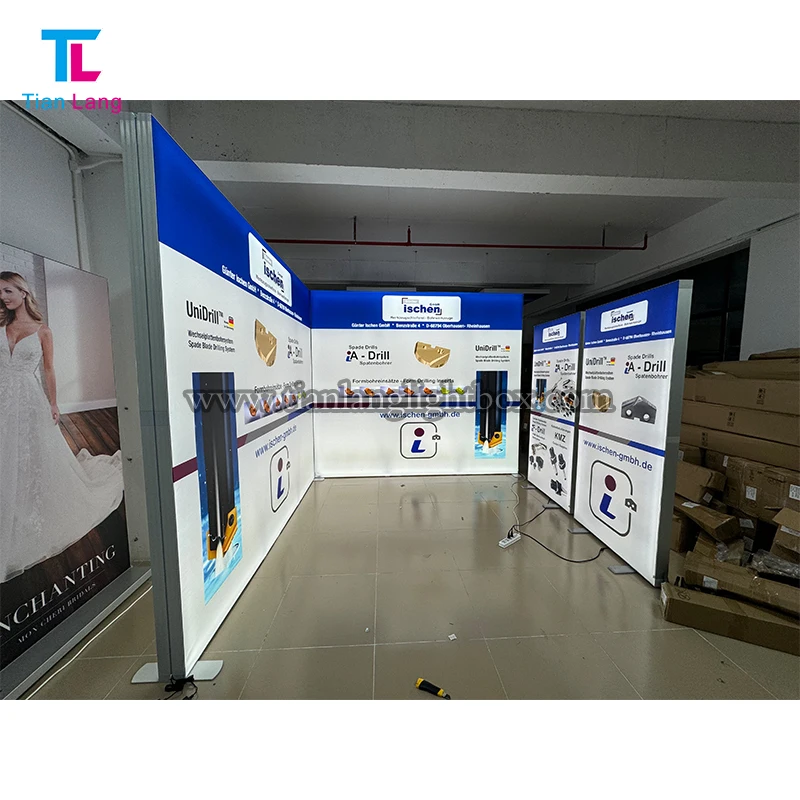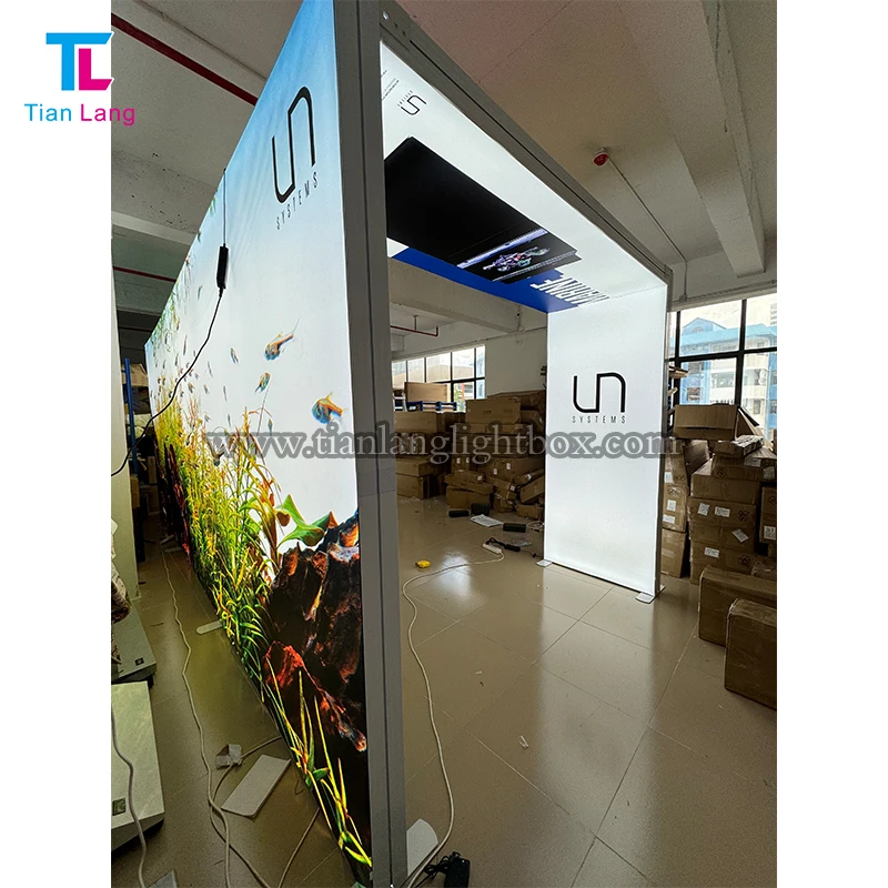 10X10 персонализиран тензионен тканен дисплей с алуминиеви рамки за търговски стенд, изложителен стенд с тканено осветление