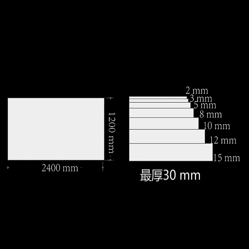 El grosor va de 1mm a 35mm. Con superficie lisa, las tablas pueden usarse para impresión profesional. Por lo tanto, es comúnmente