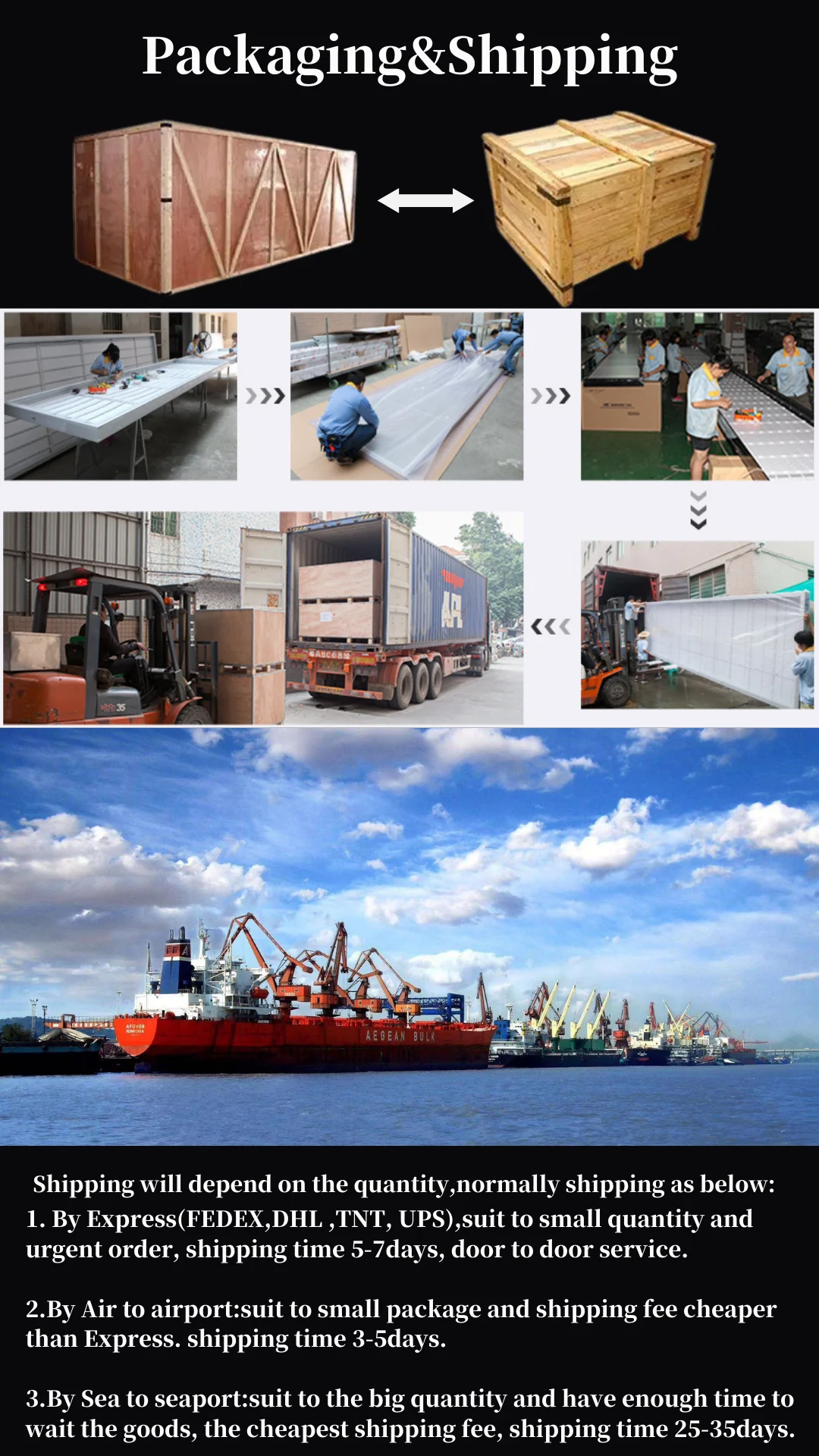 1. Por mensajería (FEDEX, DHL, TNT, UPS), adecuado para pequeñas cantidades y pedidos urgentes, tiempo de envío 5-7 días, servicio puerta a puerta.