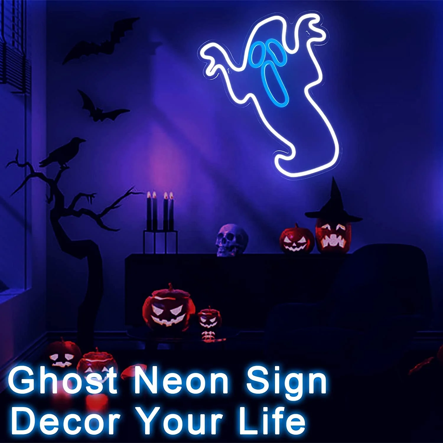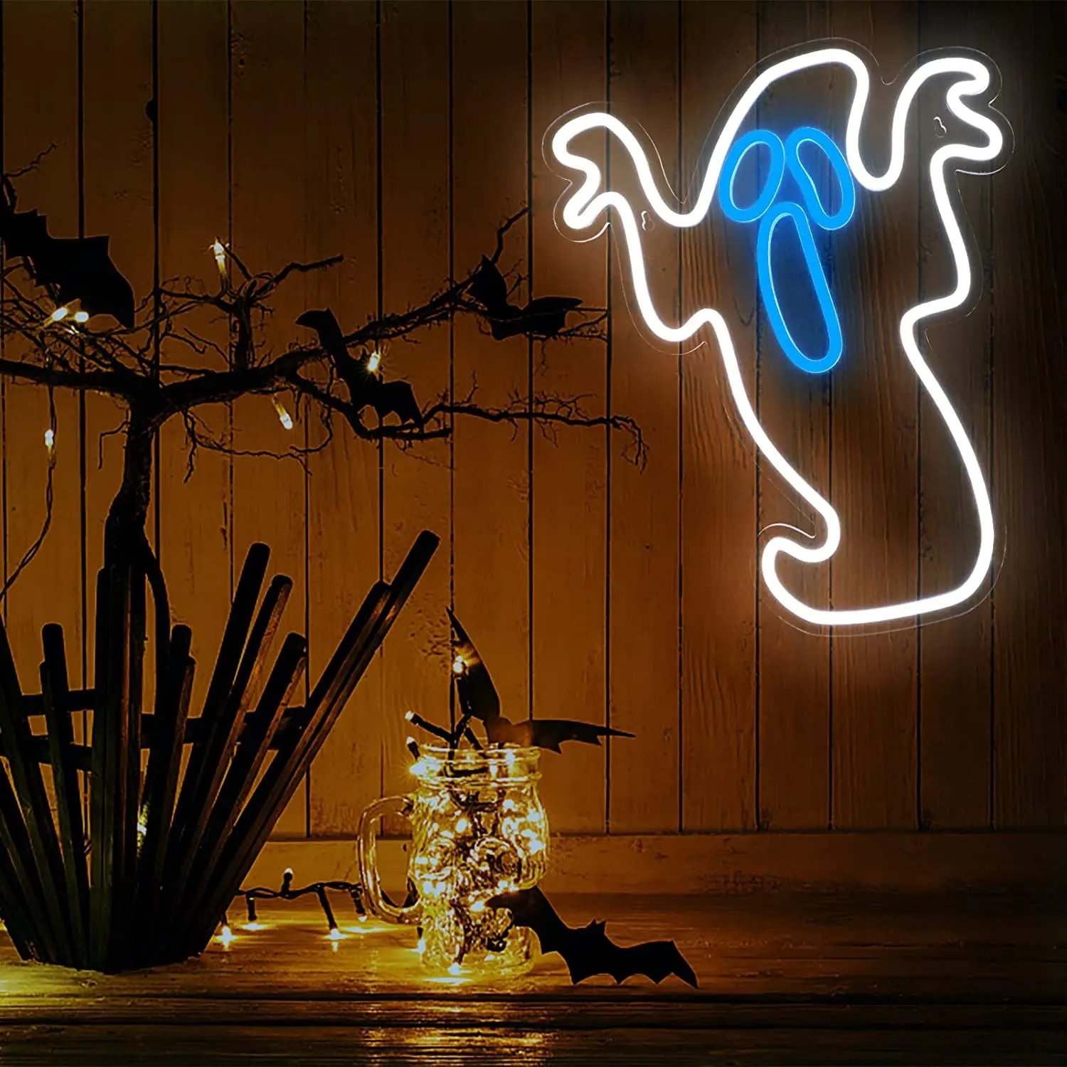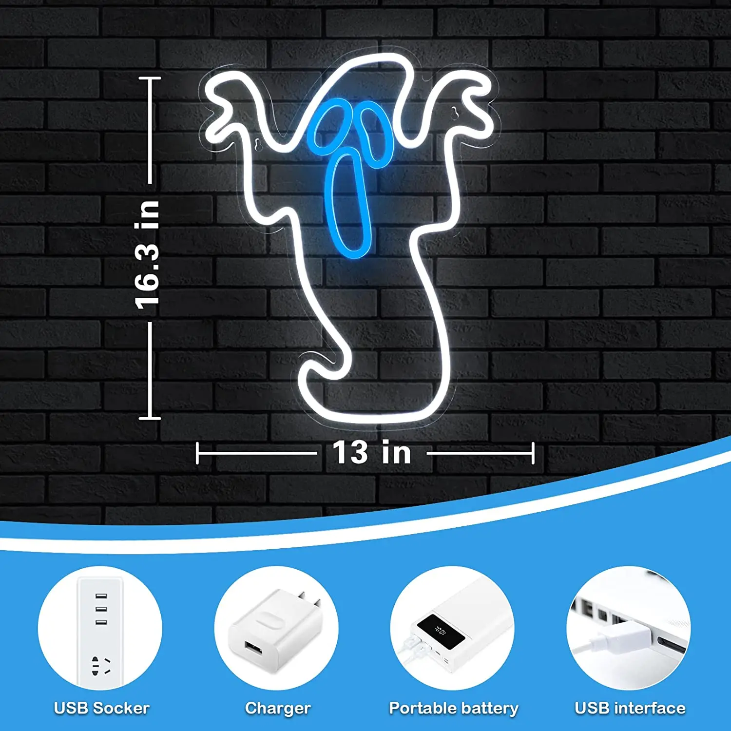 Sighn Nion Scamall Ghost LED Spooky Lá Fhéile Halloween Neon Oifig Light for Bar Party Decor Taispeántas Gaeled 10X8 Incse