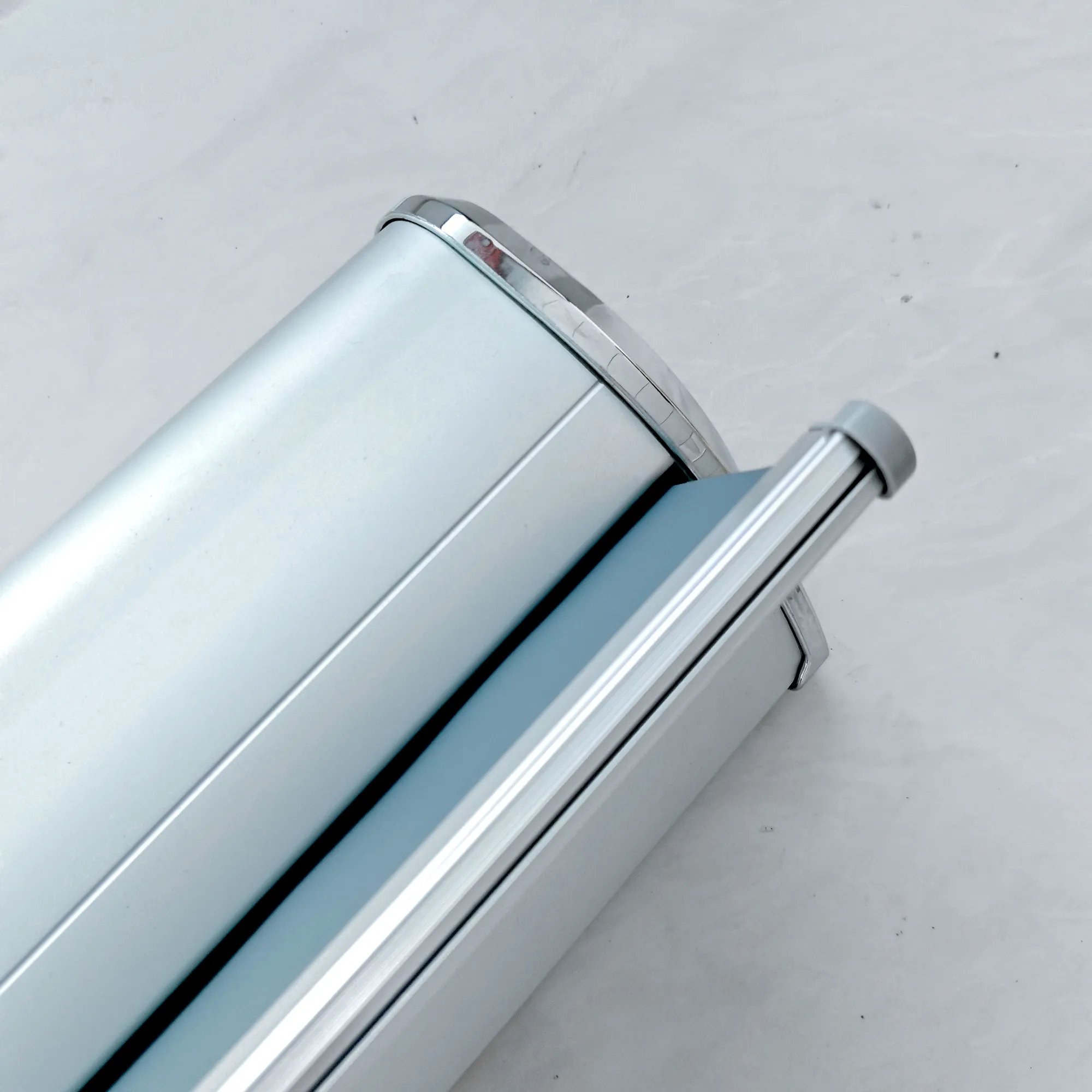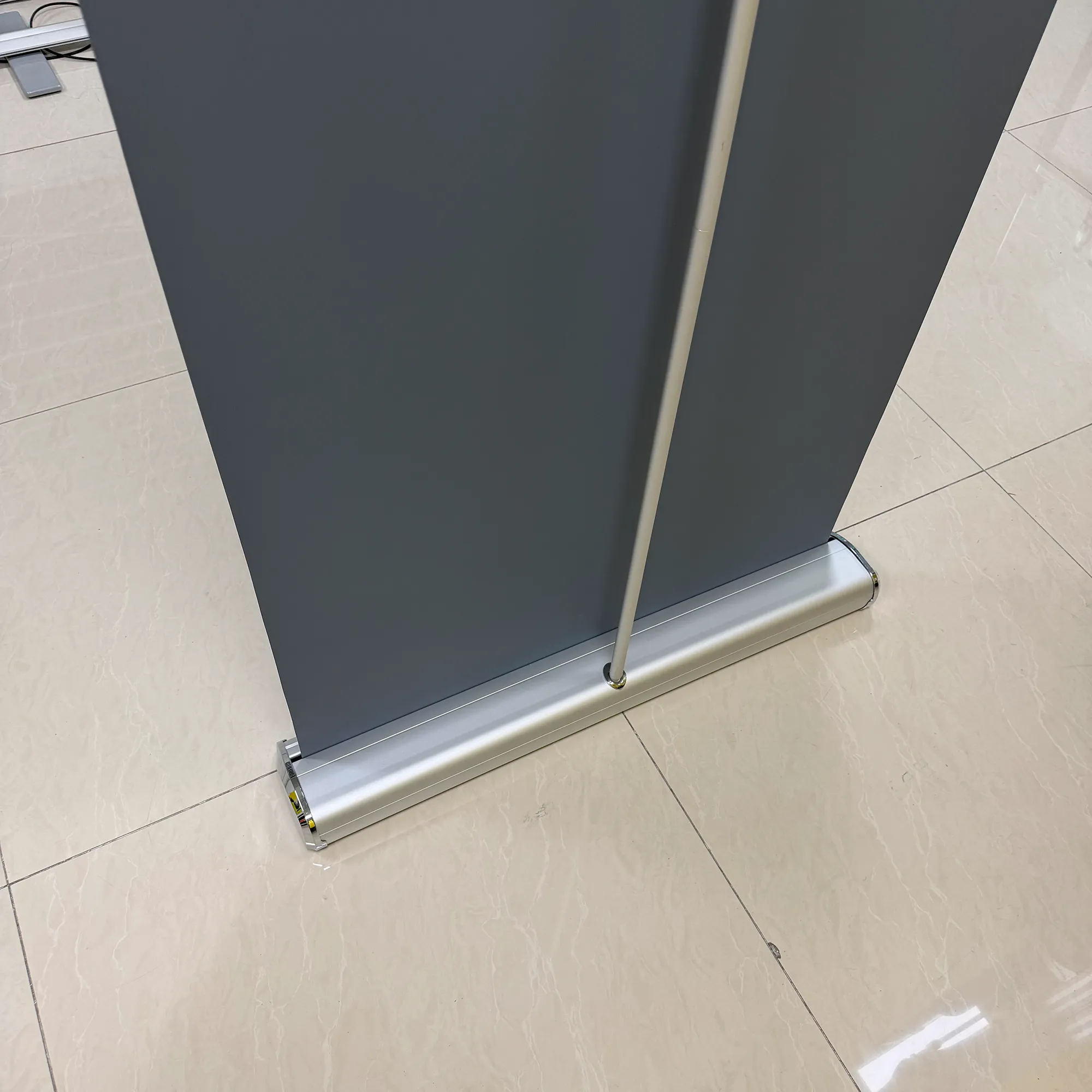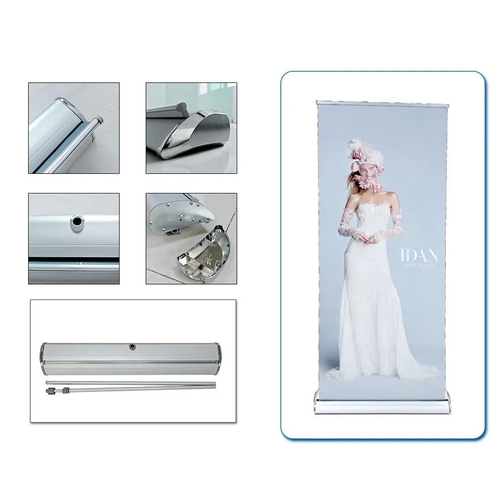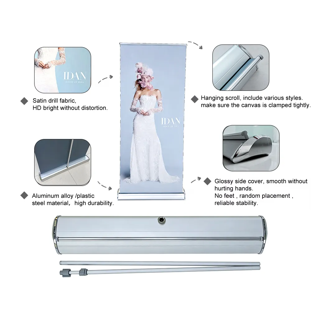 Классическая стойка для баннера-роллера с пружинным механизмом хранения, изображение автоматически сворачивается. Портативная конструкция, подходит для выставок, конференций, магазинов и различных мероприятий.