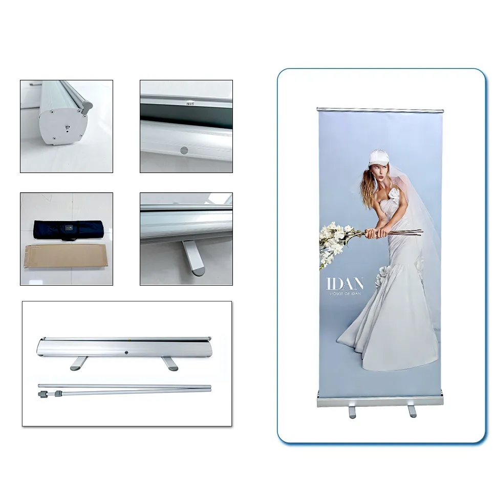 Классическая стойка для баннера-роллера с пружинным механизмом хранения, изображение автоматически сворачивается. Портативная конструкция, подходит для выставок, конференций, магазинов и различных мероприятий.