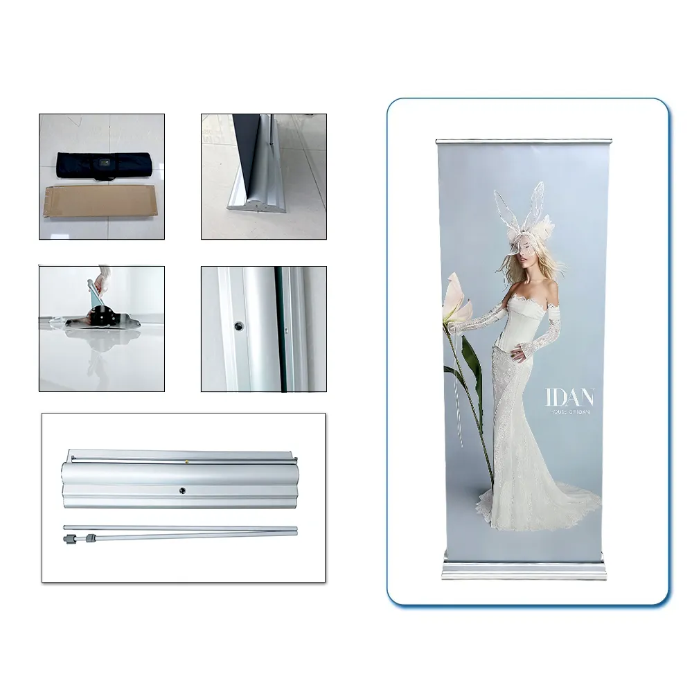 Классическая стойка для баннера-роллера с пружинным механизмом хранения, изображение автоматически сворачивается. Портативная конструкция, подходит для выставок, конференций, магазинов и различных мероприятий.